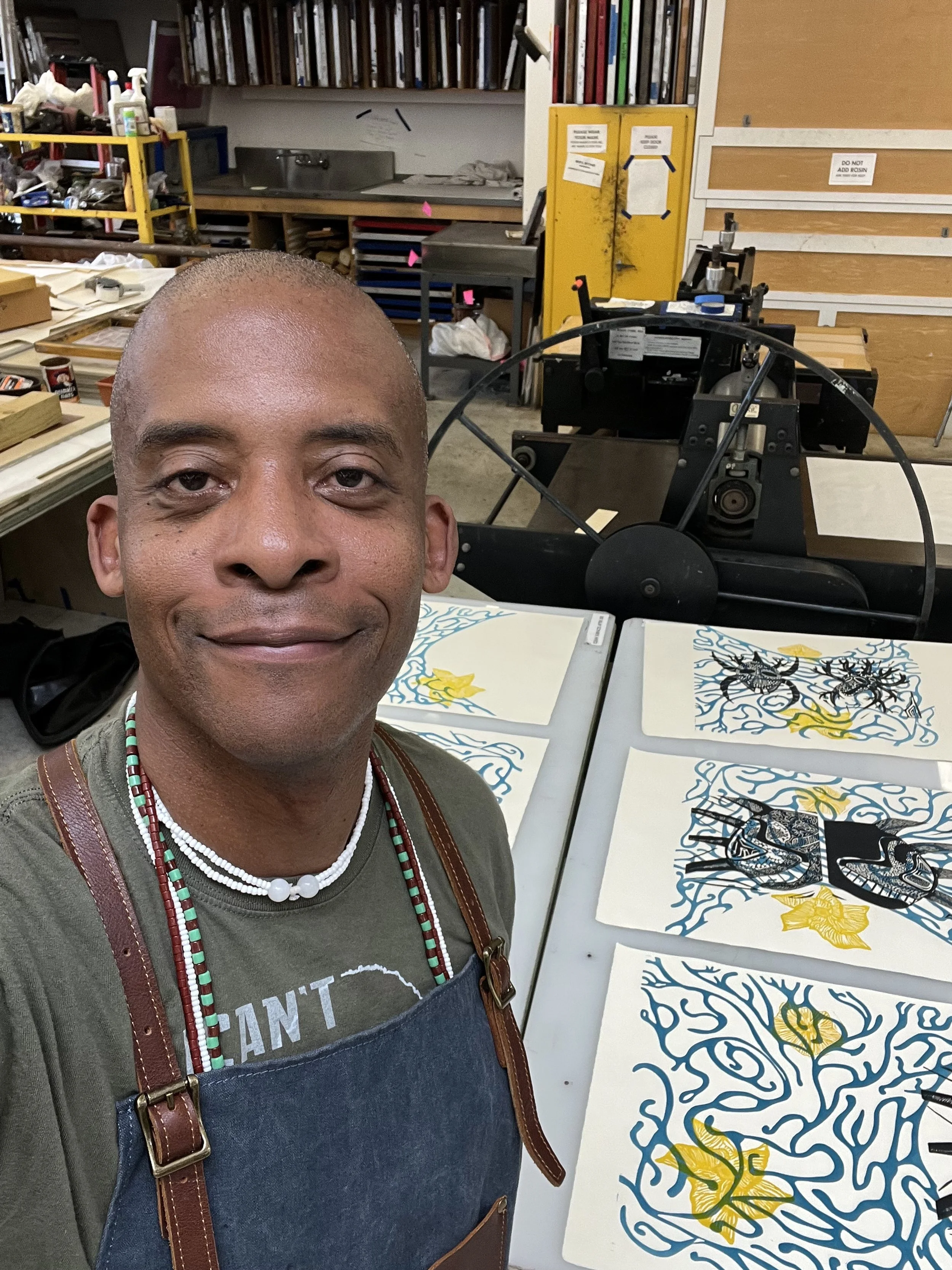 Tenjin Ikeda is an Afro-Puerto Rican artist born and raised in Brooklyn, New York on October 30, 1968. Where at a very young age learned the importance of cultural and spiritual tradition and heritage from his mother. At around 8 years old he taught himself how to draw and was hooked, he has been seriously making art for 30 plus years using the various mediums of painting, sculpture, and printmaking. He attended the School of Visual Arts in New York first focusing on graphic design and ultimately Fine Arts where he felt more freedom to express himself. It was at the Art Students League that he discovered printmaking, which has been his focus for the past 25 years. “It is my desire to continue to visibly show the richness of my ancestry to the world.” He has various works in private collections in the US, Canada, Mexico, Bahamas as well as acquisitions by The Schomburg Center for Research in Black Culture, The Print Club of Albany, and the Art Student’s League. Tenjin’s work has been featured as cover art and illustrations for various books. He has been included in “Modern Printmaking” a book of 30 contemporary printmakers by Sylvie Covey, and Botanical Block Printing by Rosanna Morris.